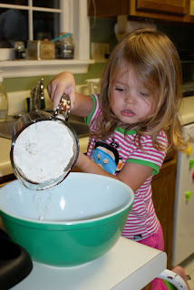 When she woke up, we made big breakfast together. The birthday girl asked for chocolate chip pancakes and bacon, so that's what we made. She was eager to help, so we got started.
